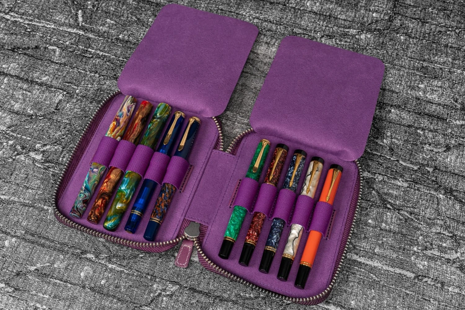 This Leather Zippered 10 Pen Case in black has a velvet lined interior. When you want to carry your favorite pens, you want them protected in your bag, purse or pocket to avoid ink leaking everywhere or getting them scratched. This leather pen holder is great to protect your fountain pens and keep them safe.  Pens are not included.