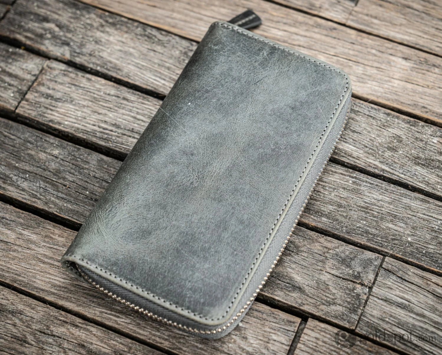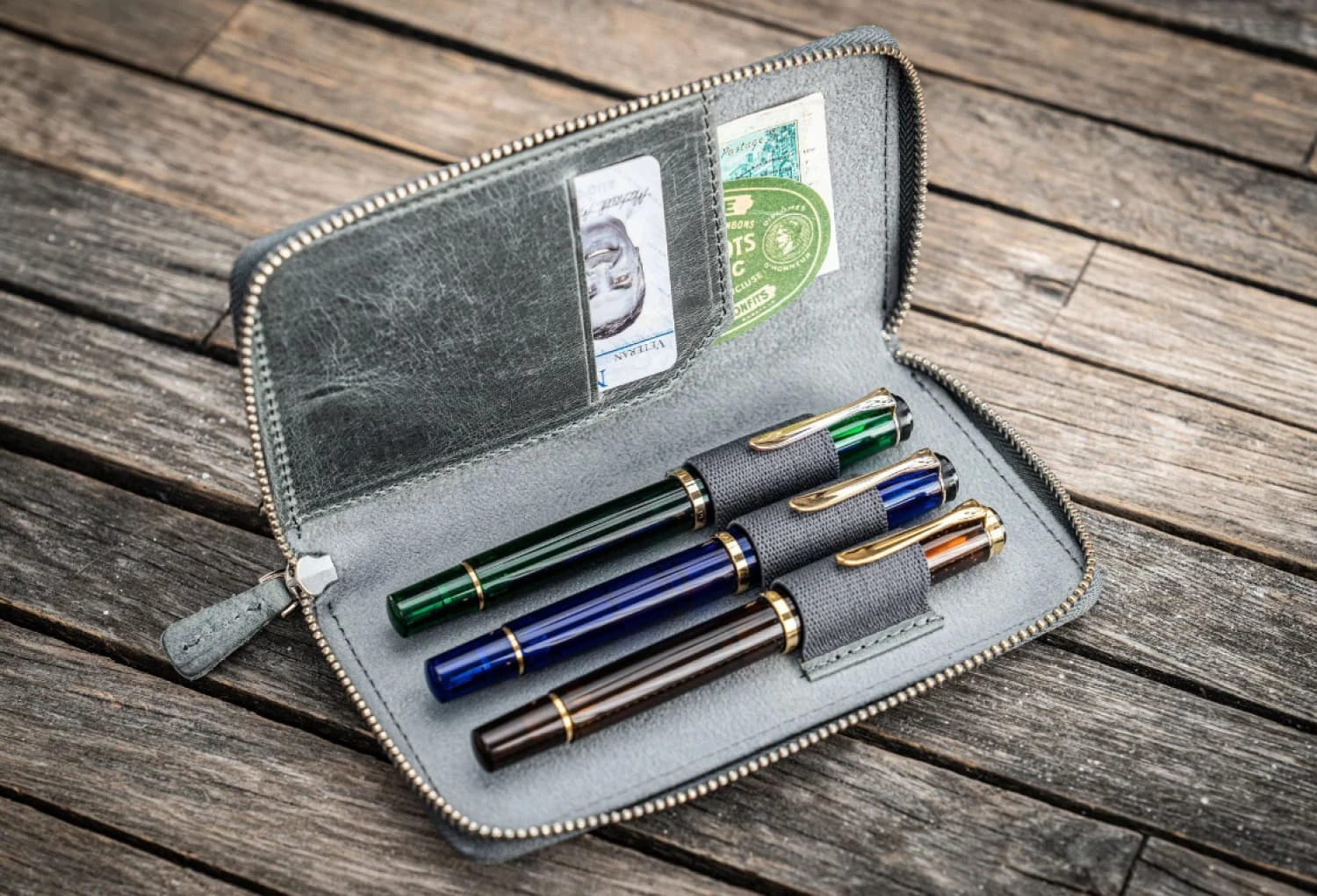 Galen Leather Zippered Three Pen Case In Crazy Horse Smoky Grey