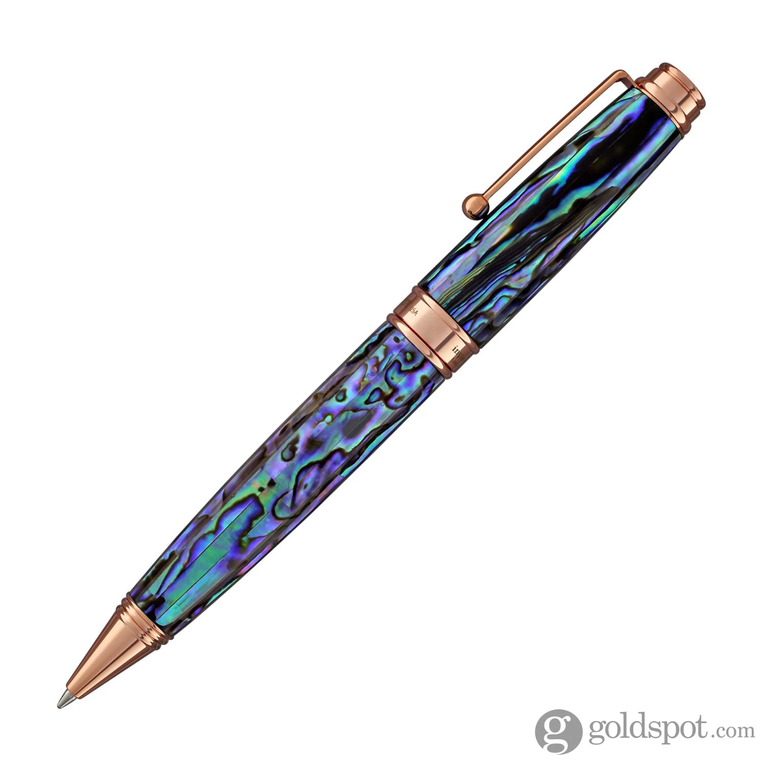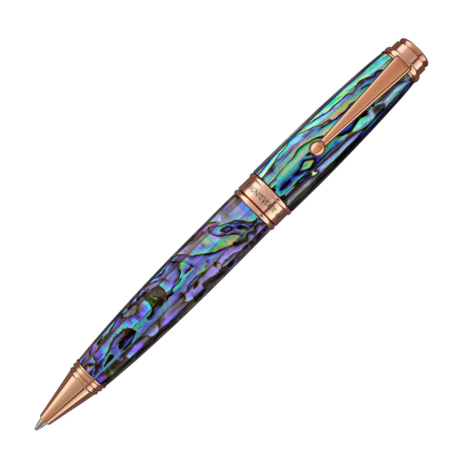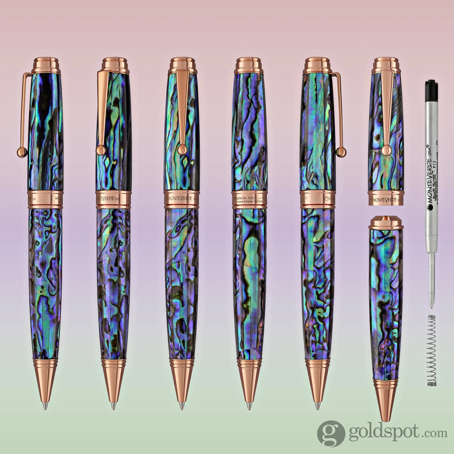 The Monteverde Invincia Deluxe Abalone features a highly iridescent inner nacre layer of authentic abalone shell from New Zealand. The shell of abalone has traditionally been used as a decorative item, in jewelry, buttons, and as an inlay in furniture and in musical instruments. The inner shell of the abalone is a swirl of intense colors, ranging from deep cobalt blue and peacock green to purples, creams, and pinks. Hand-turned and hand-polished, the barrel brilliantly reflects shimmering light off of its surface, enhancing the stunning colors of the Abalone shell. Available with trims in lustrous chrome, gunmetal or rosegold.