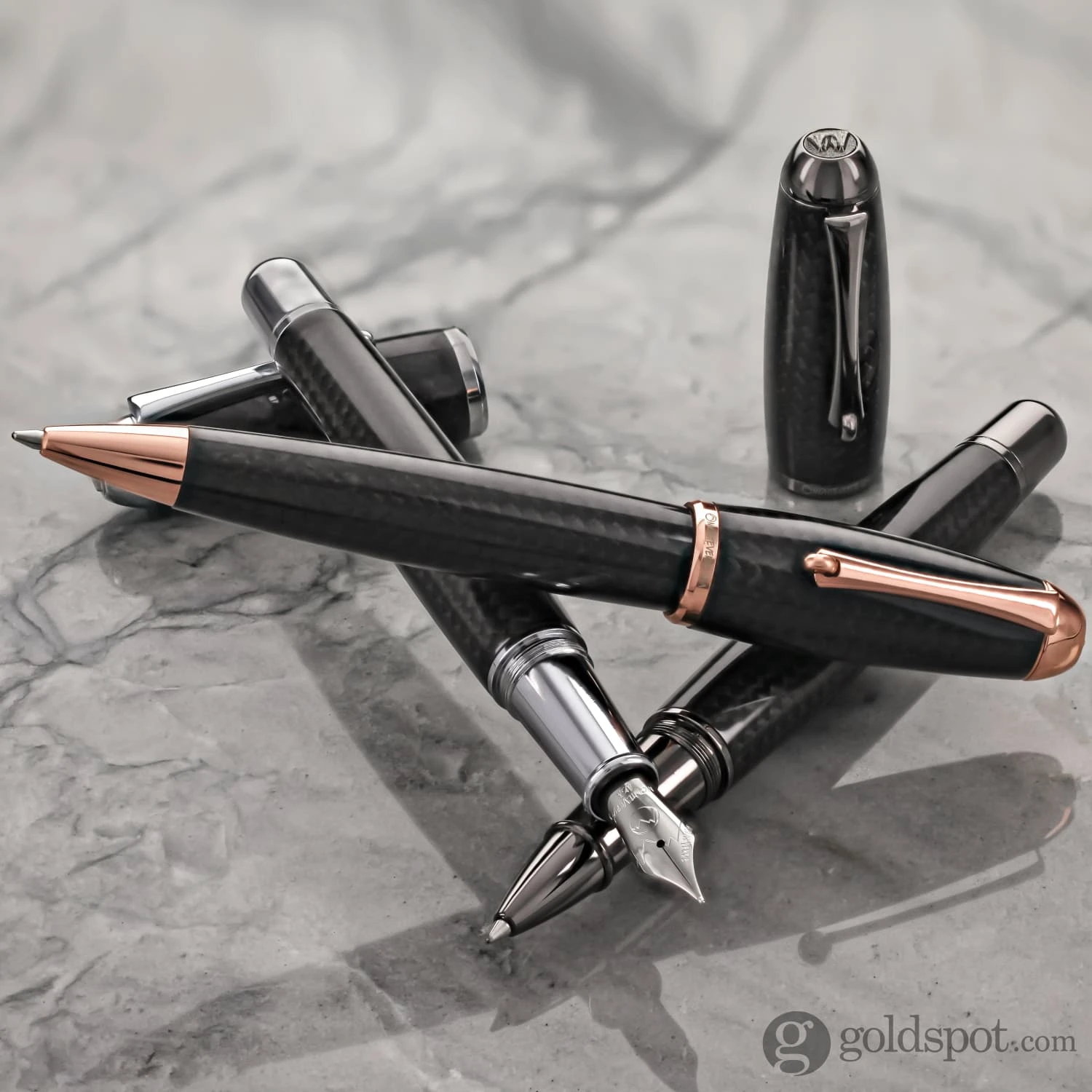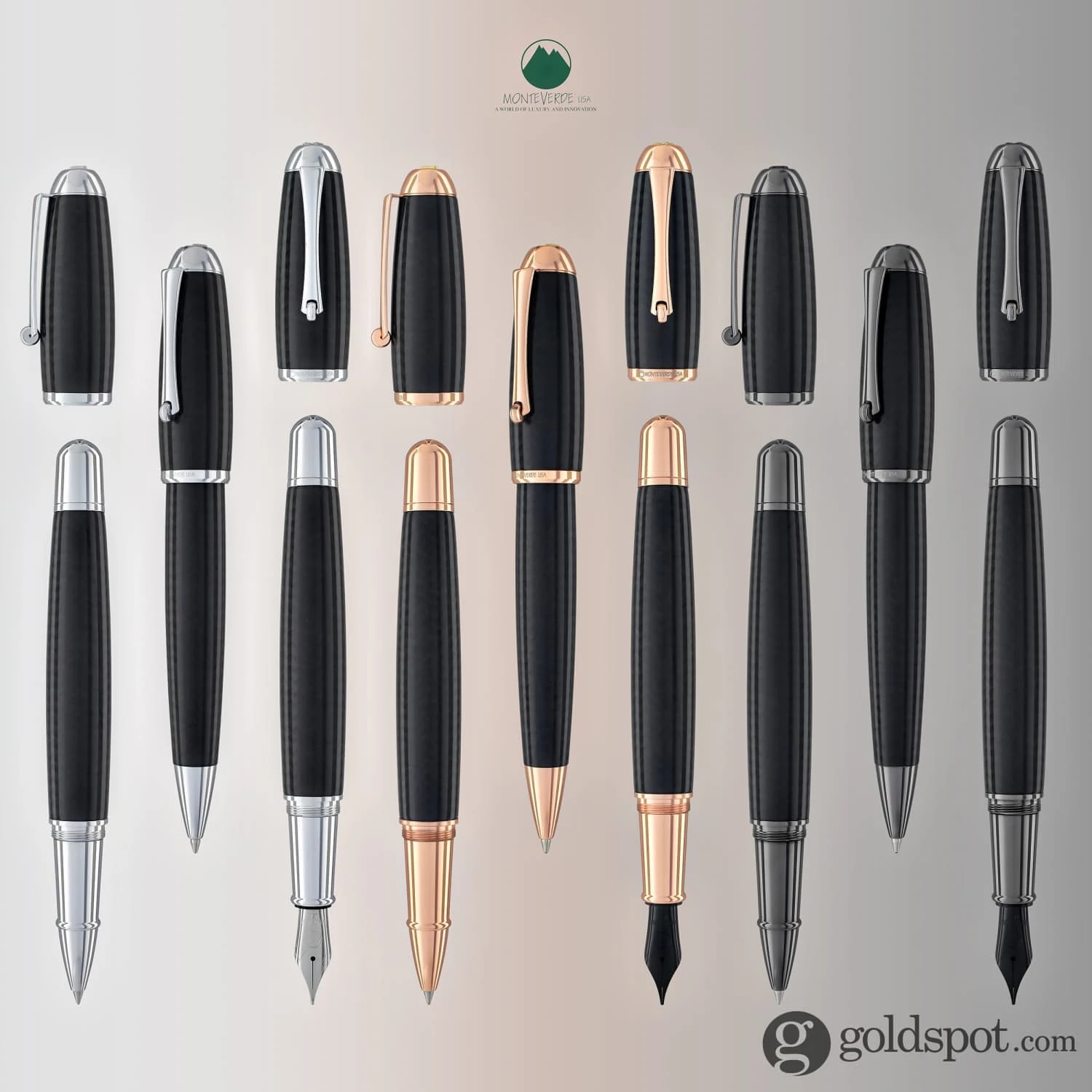 Monteverde introduces the largest Carbon Fiber Pen ever made. The Mega™ collection is one of the oldest and most successful Monteverde USA® collections. Initially launched solely as an Ink•Ball pen, Mega quickly gained worldwide recognition for its extraordinary performance and unique design. It has been featured in some of the world’s most prestigious publications including the New York Times. The Mega is well known among pen aficionados for its substantial size, durability and exceptional writing performance. While the Mega collection has seen several distinct versions over the years, the new Super Mega Carbon Fiber brings the writing experience to another level. Carbon fiber is a polymer, a material made of a long, repeating chain of molecules or macromolecules, which produces a very strong material that is also very lightweight. Stronger than steel when properly utilized, carbon fiber is extremely durable and resistant to the type of damage and wear and tear common to writing instruments. The design of the Monteverde Super Mega™ Carbon Fiber features elegantly contoured carbon fiber treated with a clear protective layer on the cap and barrel, making it comfortable in hand and extremely durable. The Super Mega Carbon collection is available in three distinctive trims, (rose gold, chrome, and gunmetal) and is offered in three modes: fountain pen, rollerball and ballpoint.