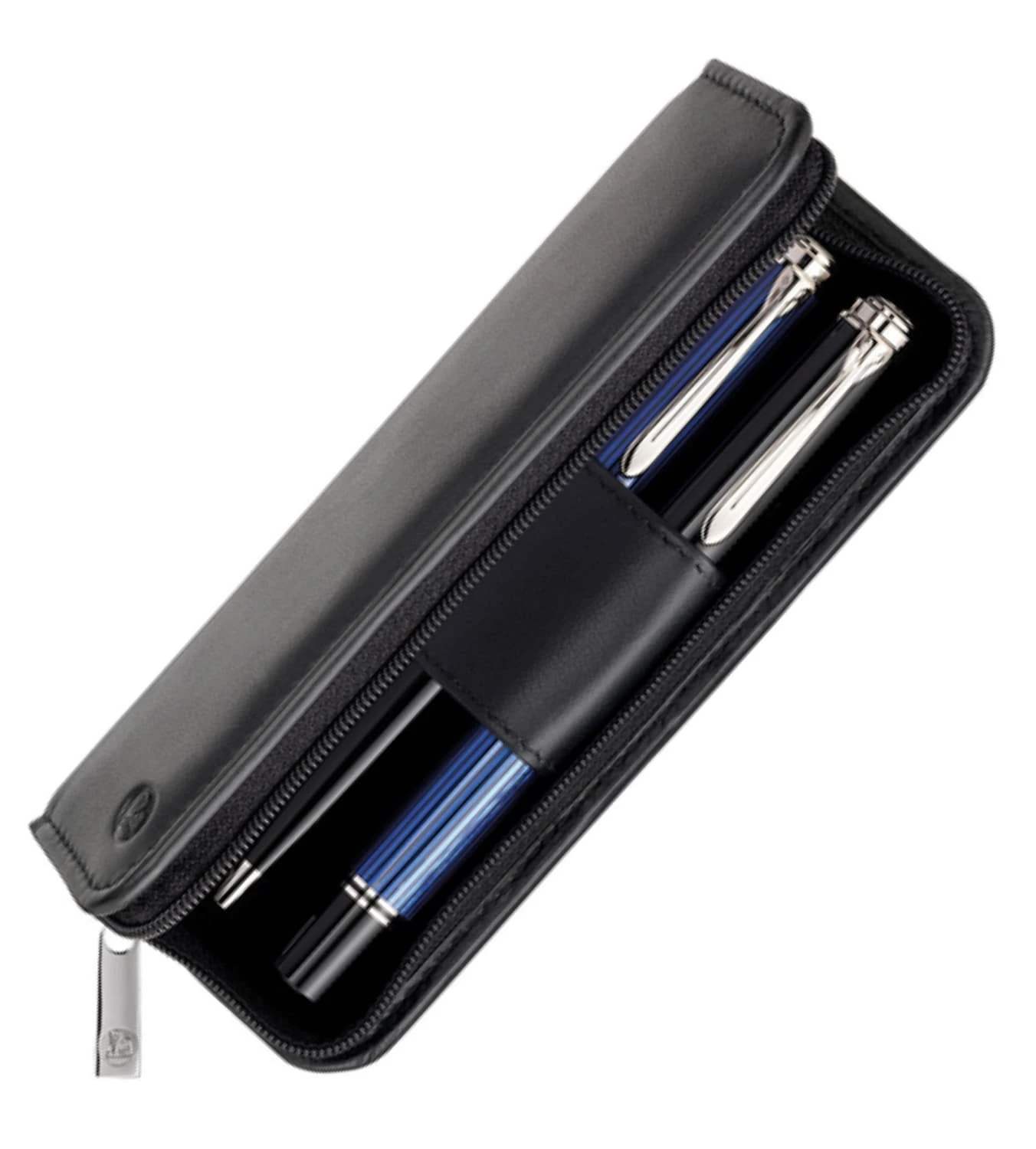 Pelikan takes the leather pen case to a new level with high-end quality, 100% cow hide leather in smooth nappa. Each distinctive case is embossed with the Pelikan logo on the front and are closed securely with a durable zipper. The interior lining is made of luscious black velvet to protect your precious writing instruments. Two stitched elastic loops hold your valuable pens in place.