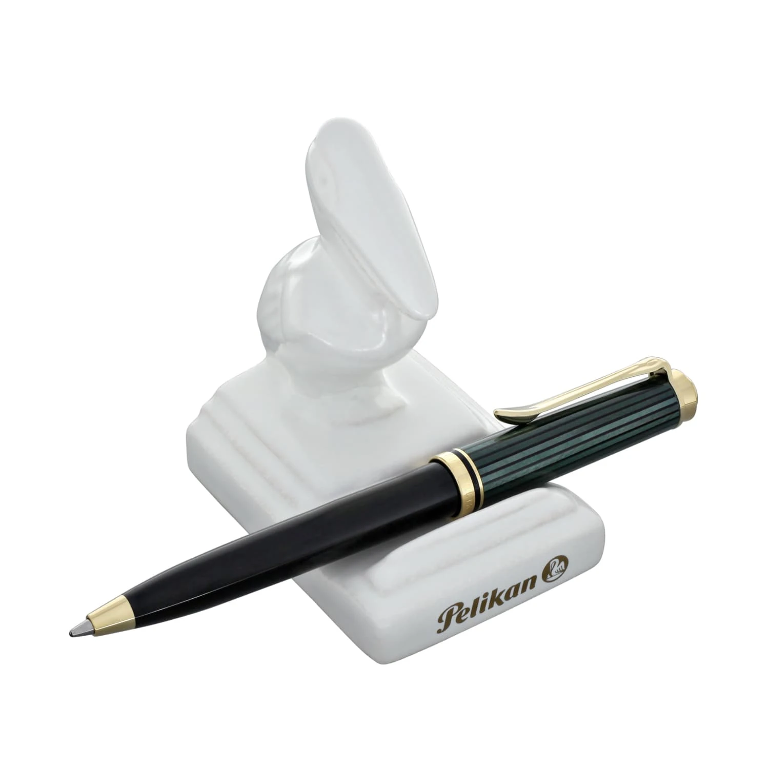 Are your Pelikans in need of a place to roost? The simple and elegant ceramic Pelikan pen stand is a fine place for your writing instruments to rest. The smooth, white exterior of the stand is in the shape of a pelican chick and features the Pelikan logo printed in gold on the front. The curved space can accommodate your largest pens (max 15mm diameter) without taking up much space on your desk.