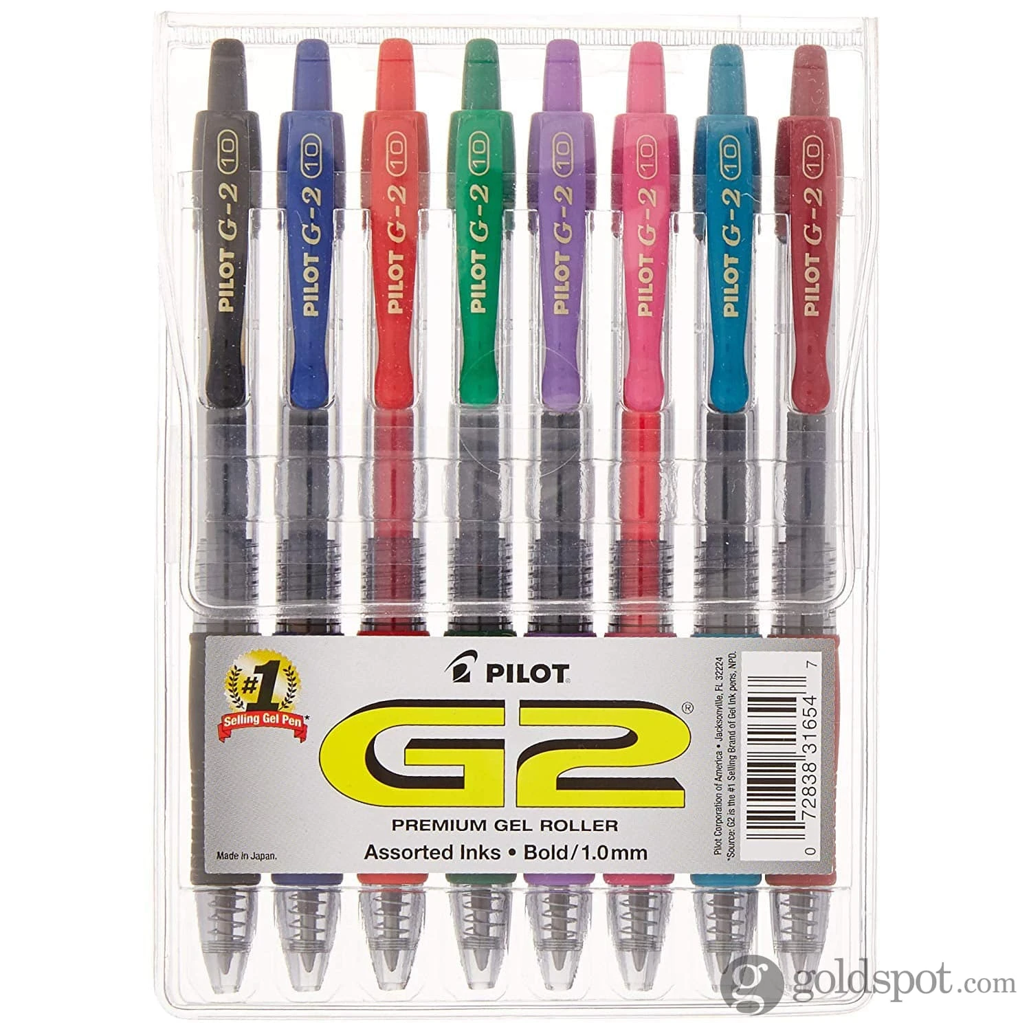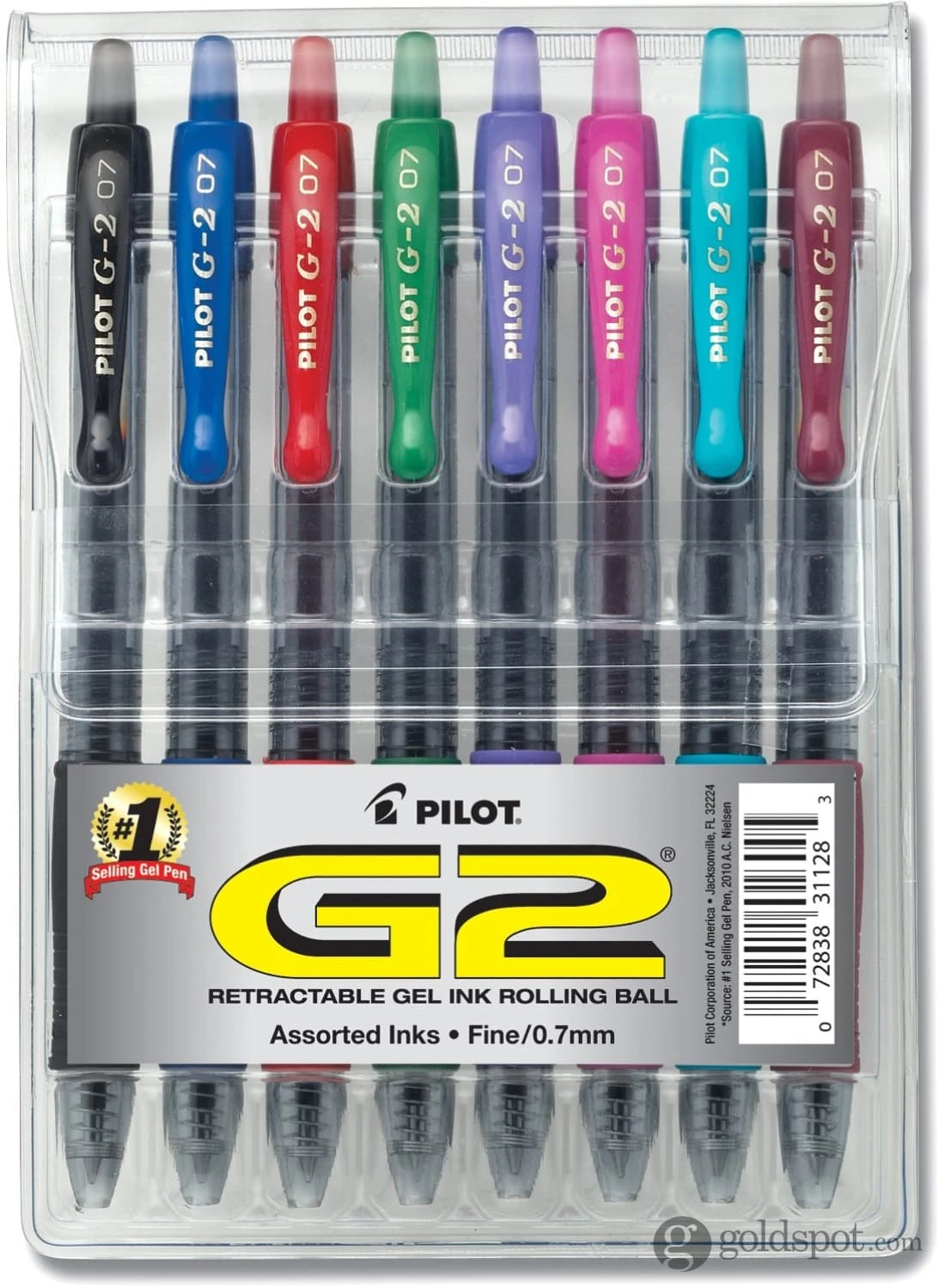 The Ideal Pen for Overachievers: The smooth writing, long-lasting Pilot G2 Retractable Gel Ink Rolling Ball Pens come in Black, Blue, Red, Green, Purple, Pink, Turquoise & Burgundy. The G2 features a comfortable rubber grip, & is available in ultra fine, extra fine, fine, & bold point.