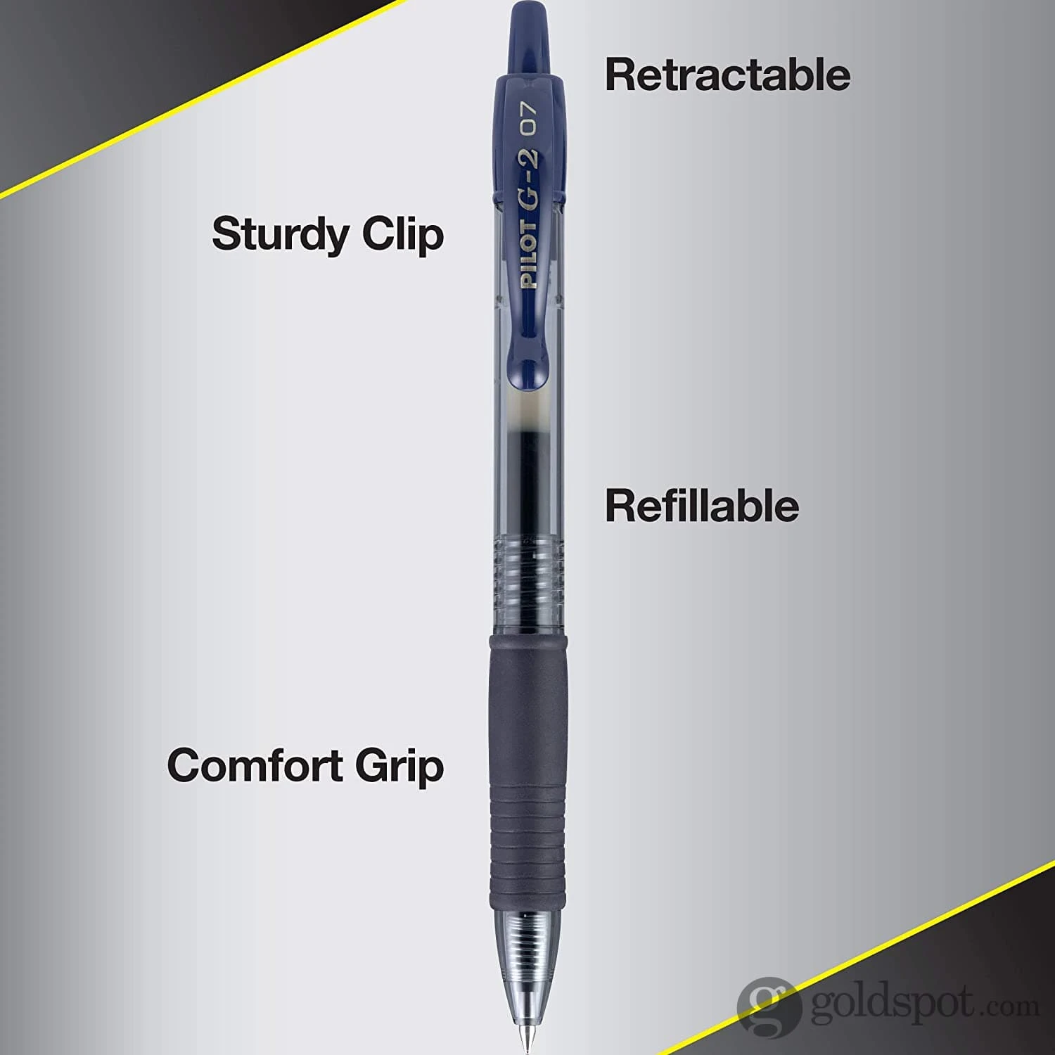The Ideal Pen for Overachievers: The smooth writing, long-lasting Pilot G2 Retractable Premium Gel Ink Pen in Navy Blue features a comfortable rubber grip, & is available in ultra fine, extra fine, fine, & bold point.