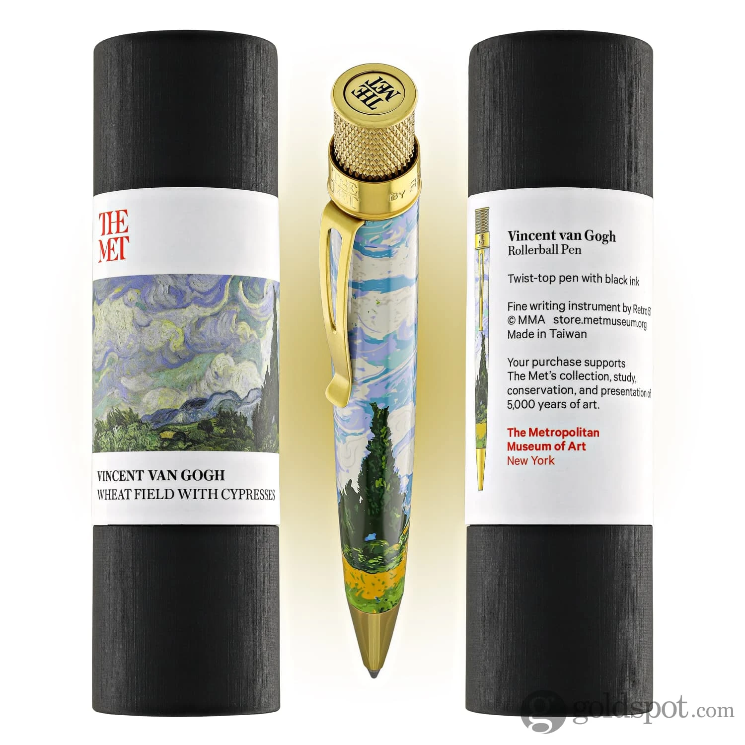 Vincent van Gogh’s Wheat Field with Cypresses joins the Retro51 x The Met collection. Cypresses gained ground in Van Gogh’s work by late June 1889 when he resolved to devote one of his first series in Saint-Rémy to the towering trees. Van Gogh regarded this painting as one of his “best” summer landscapes and was prompted that September to make two studio renditions. This painting plus another vertical composition are part of The Met collection among many paintings by van Gogh. Retro51 is honored to present this new rollerball pen based on the master artist’s groundbreaking work. Multiple colors have been silk-screened onto the stainless barrel to recreate this artwork, framed with polished brass accents. The Met logo is featured on the top ring and finial with a numbered top disc. This pen comes in commemorative packaging tube with a base that can double as a pen stand when it is not in use. Add a van Gogh to your writing collection and discover new creativity at your fingertips.