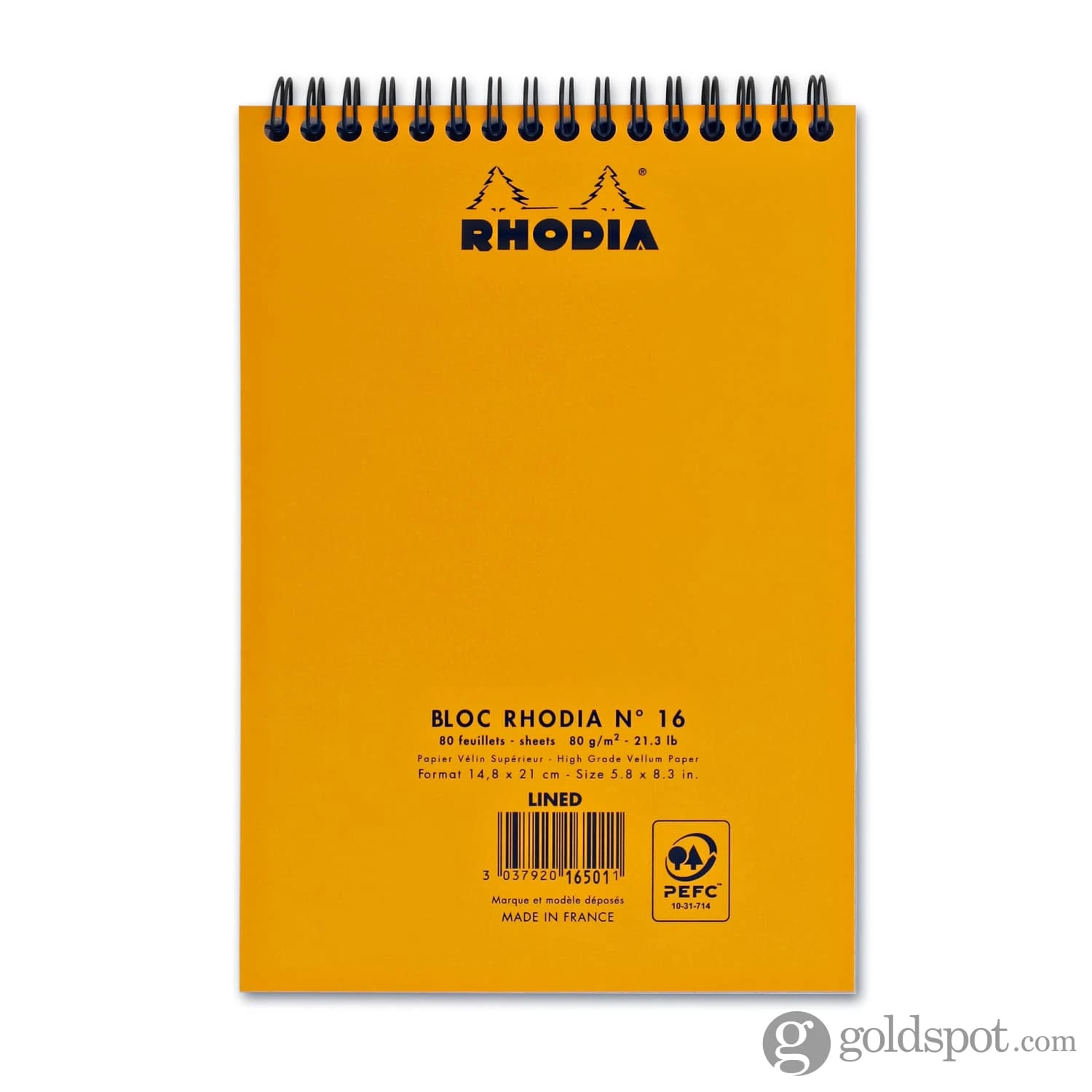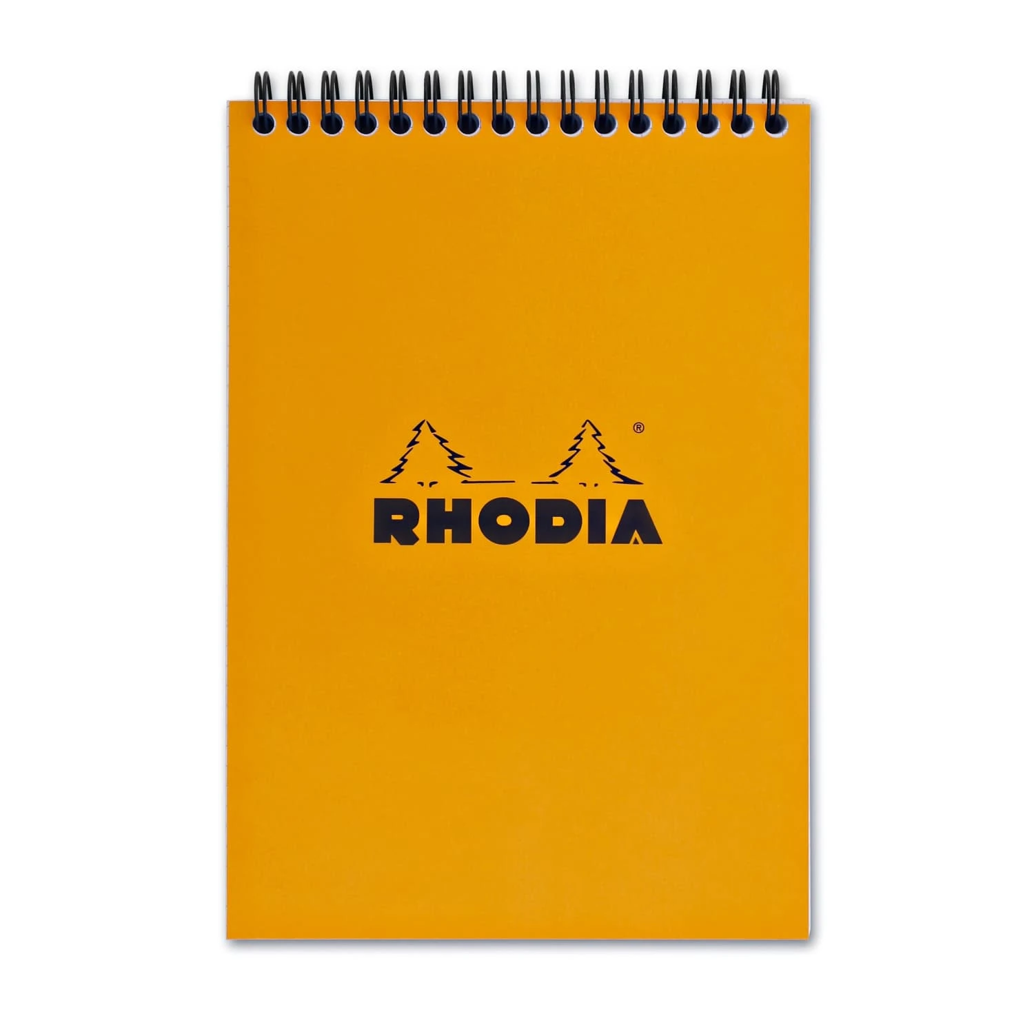 This Rhodia Top Wirebound Notepad features 80g smooth extra white Rhodia paper with waterproof orange or black coated cover. Double wire-binding for strength and no snag. Stiff cardboard backing provides support for writing and sketching on the go. Fountain pen Friendly!