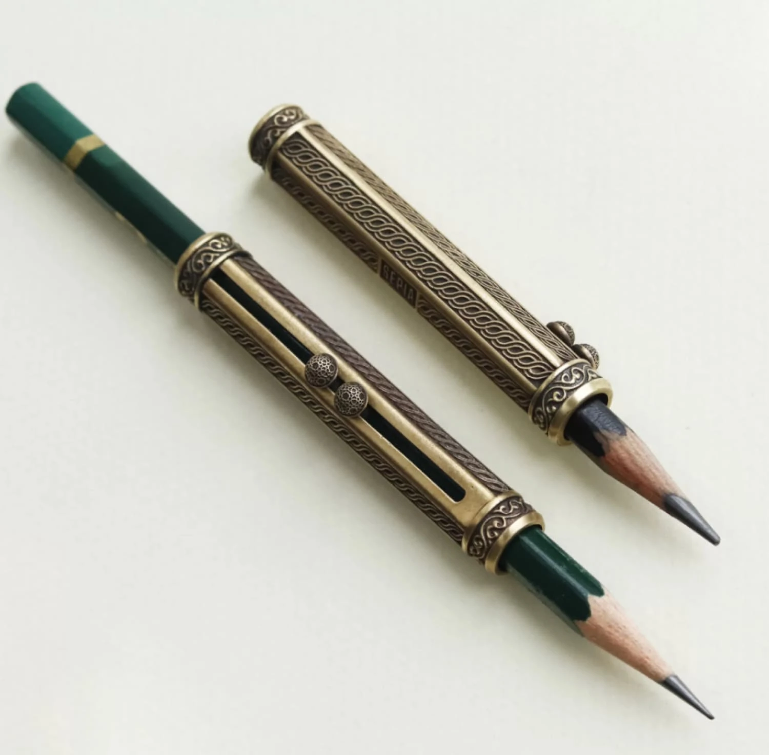 The design of this pencil extender draws inspiration from Seljuk ornamental art, showcasing an interlocking chain pattern that adds decorative flair. Its outer shape resembles a hexagon, mirroring a pencil, while the interior boasts a rounded form. Created through manual compression using a specialized apparatus, this extender combines artistic detail with practical functionality.
